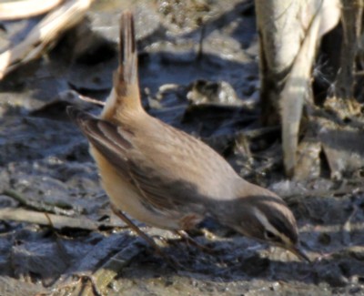 | ・頭からの上面はオリーブ褐色で、腰の脇から外側にかけて橙色部がある。眉斑は白色。 |
