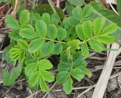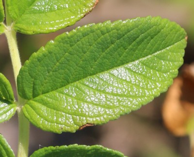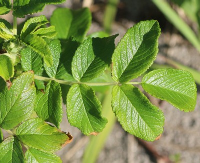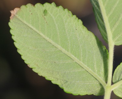 | ・小葉は長さ2〜3cmの楕円形または卵状楕円形。先端はまるく、ふちには鋭い鋸歯がある。裏面には短い軟毛が密生し、腺がまじる。 |