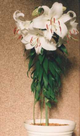 | ◎植え替え/10月〜11月。下根を傷めないように注意しながら抜き取り、軽く水洗いして、殺菌剤で消毒する。水を切る程度に陰干しし、すぐに新しい用土で植え替える。ユリの生育では、上根が大切なので、深植えにする(球根の2倍以上)。オリエンタル系(カサブランカ等)の大きな球根なら7〜8号鉢に一球、アジアティック系やテッポウユリでは5〜6号鉢に1球植え付ける。鉢植えの場合は、毎年堀りあげて植え替えると良い。赤玉土7、腐葉土3の混合土が基準。 |