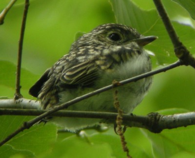| ・同じ仲間「サメビタキ」の目先は汚白色か白味がない。胸と脇腹の色も濃い。「エゾビタキ」の胸と脇腹には暗褐色の縦斑がある。 |
