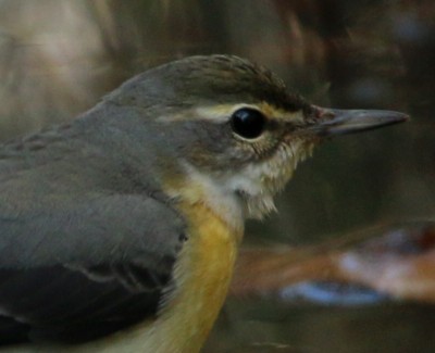 | ・[雄] 雌雄ほぼ同色。頭からの上面は黄緑色がかった灰色で、腰は黄色。眉斑と顎斑は白く、喉は黒い。 |
