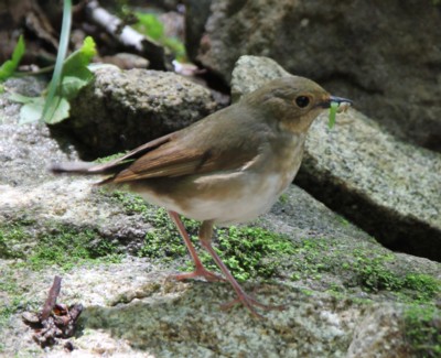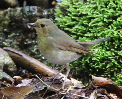 | ・[雌] 全体がオリーブ褐色で、腹は白っぽく、肩羽や腰、尾羽には青味がある。 |