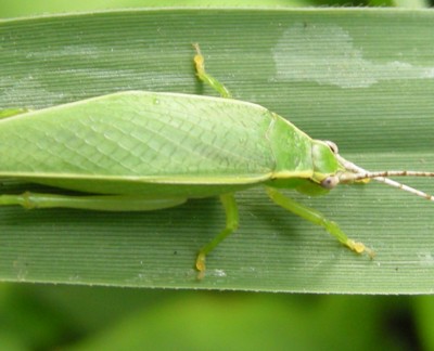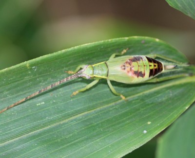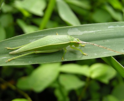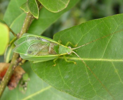 ・熱帯アジア原産の帰化種で、全身あざやかな緑色をしたマツムシの仲間。