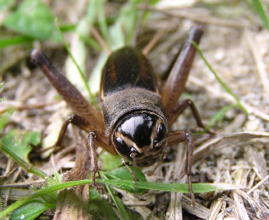 ・日本にいるコオロギの中で最も大きい。体色は焦げ茶色、頭は黒くて丸い。顔面に白い眉状の斑がある。