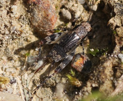 ・後脚腿節に白黒のマダラ模様がある。芝生や草地に生息する。
