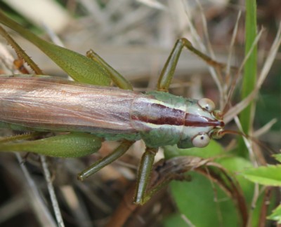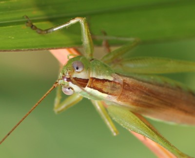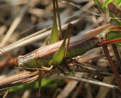 ・雌の長い産卵管が特徴のササキリの仲間。緑色型と黄褐色型がある。