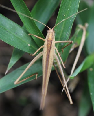・体の背面に条のあるツユムシの仲間。緑色型と褐色型がある。
