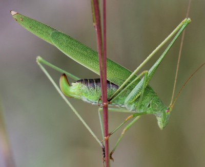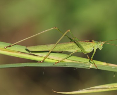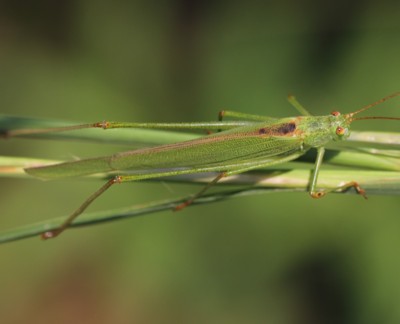 ・全体に草緑色をしたキリギリスの仲間。明るい草地の背の高い植物の上などにいる。緑色型のみ。