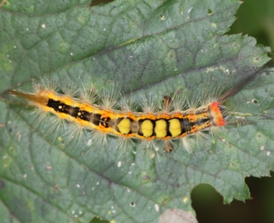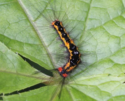 | ・前胸の気門前瘤起は橙赤色で、黒色の長い毛束、第1〜4節の背面には白色〜褐色の歯ブラシ状の毛束がある。 |