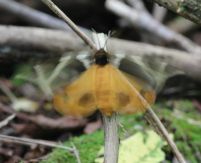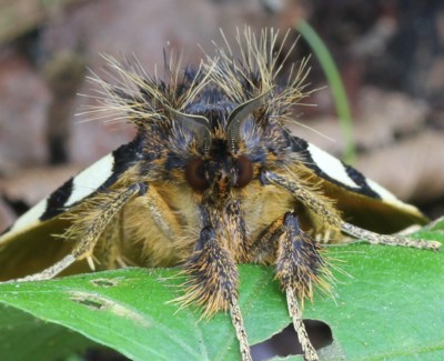 雄の写真は撮れていませんが、黒い翅に白い帯が一本あるだけです。ぱっと見は、マダラガ科の「ホタルガ」に似てます。 |