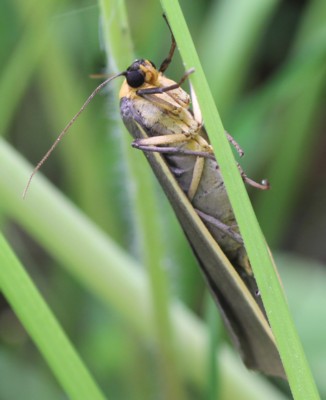同じ仲間で良く似た「キベリネズミホソバ(Ghoria gigantea)」は、頭部が橙黄色で翅の色が本種より薄い。 |