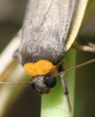 ・翅は灰黒色で前翅の前縁は黄色。頭部は黒色、頸板は橙色。