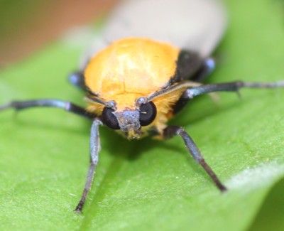 ・[雄] 前頭と前翅の前縁、脚は黒色。胸部と前翅の基部は橙黄色。