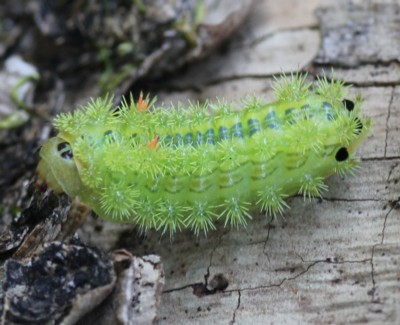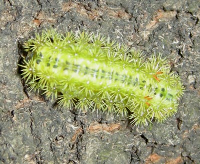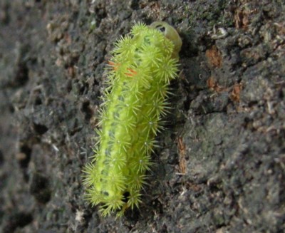 背面の左右にある橙色の棘が特徴ですが、若齢の時には無いようです。 同じ仲間「クロシタアオイラガ」「アオイラガ」。 |