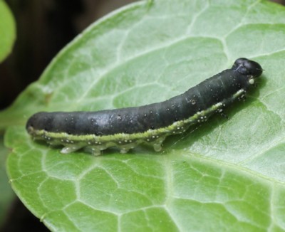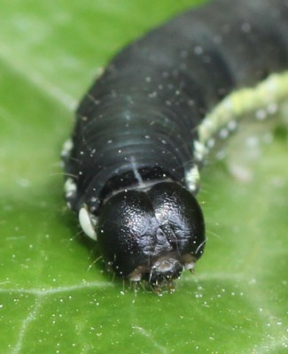 | ・頭部は黒色で丸く、体はほぼ円筒形で尾端部で細まる。気門線から背方はやや青味を帯びた灰黒色。 |