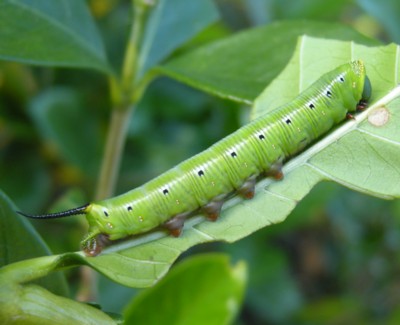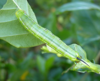 | ・[緑色型] 胴部は黄緑色で、背面は青白色を帯びる。中胸節より尾角基部まで白色の側線が走り、その復縁に沿って各環節に1個ずつの藍黒色点紋がある。 |