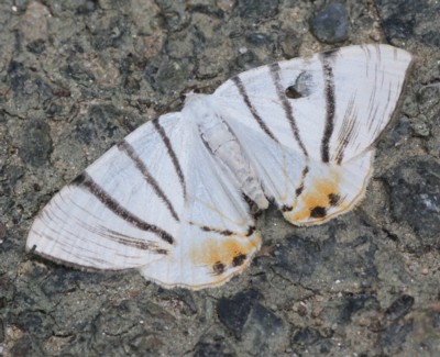 | ・白い翅に3本の黒い帯状紋があるエダシャクの仲間。雄の触角は櫛歯状。 |