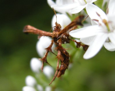 トリバガ科の翅は普通に見ただけでは、前翅も後翅もどうなってるのか解らない。図鑑によると、前翅は2本(稀に3、4本)、後翅は3本の枝に分かれ、それに長い毛が生えているそうです。 |