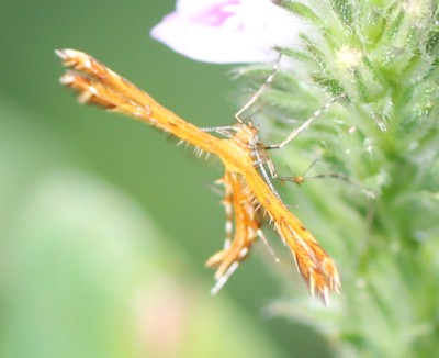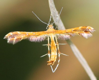 良く似た「シラホシトリバ(Deuterocopus albipunctatus)」は、前翅が3つに分かれるのに対し、本種は2つにしか分かれてない。 |