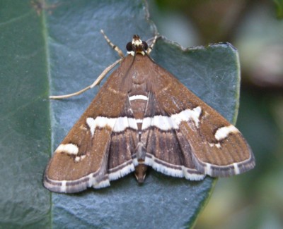 | ・褐色〜黒褐色の翅に、白い帯状紋のあるノメイガ。平地並びにやや山地で普通に見られる。 |
