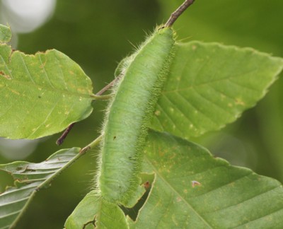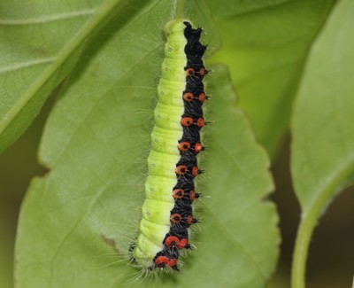 | ・4齢以降は老熟幼虫と同じ形、色彩になる。頭部は淡緑黄色。体は黄緑色で背面は幅広く白青色を帯び、全面に白〜淡黄色の毛を密生する。 |
