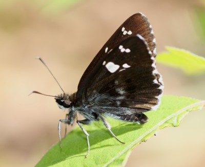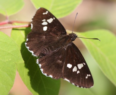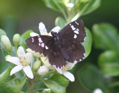 ・黒褐色の翅に大きな白い斑のあるセセリチョウ。