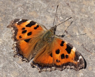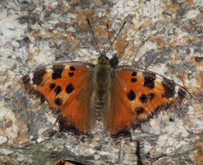 | ・橙色の翅に大きな黒色の斑紋があるタテハチョウの仲間。 |