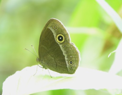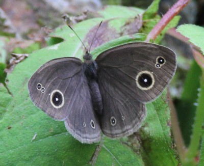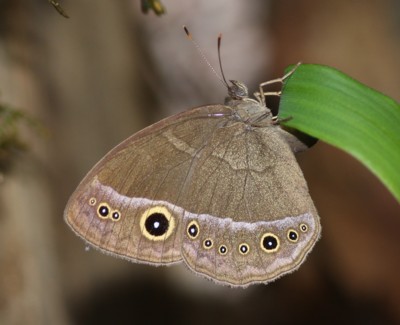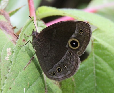 | ・翅表は黒褐色で、前翅に2〜3個、後翅に1個〜数個の眼状紋がある。 |
