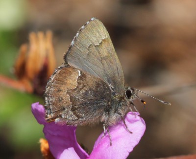| ・翅裏が濃い茶褐色をしたシジミチョウの仲間。翅表は黒色で期半部は明るい青色をしている。 |