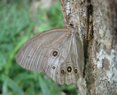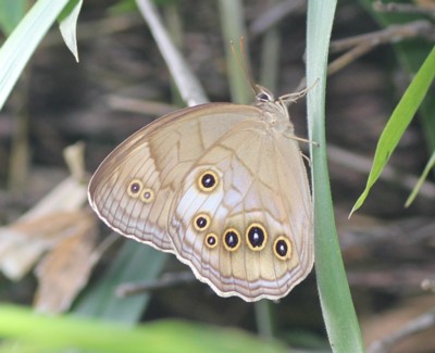 2010年8月---大きめの蝶が飛んで来て、少し向こうに止まった。この時期この場所には「ヒメキマダラヒカゲ」がよく飛ぶが、それとはちょっと雰囲気が違う。ジャノメチョウの仲間は、余程頭に入れておかないとすぐには名前が出てこない。記憶にない模様だと思ったら、やはり初物だった・・・蝶類