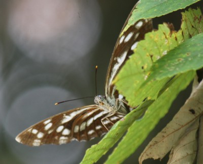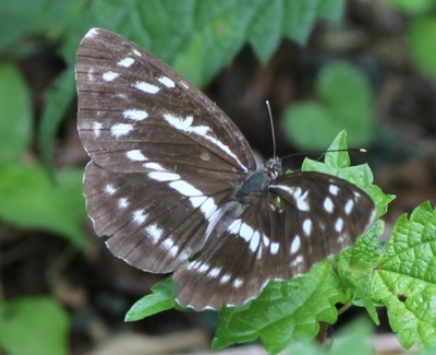 2011年7月---ミスジチョウが留まっていると思ったら、何か見た事のない斑紋・・・撮って帰り、図鑑で調べるまで本種の存在自体知らなかった。食樹のある人家周辺で多く見られると言う。・・・蝶類72種目 |