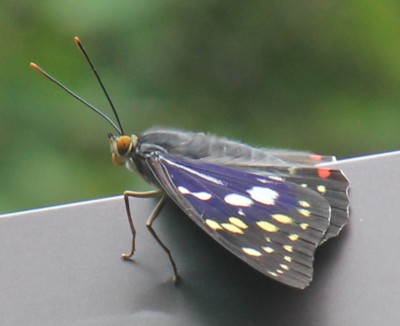 | ・雄の翅表は基部から半分ほどが紫色で白い大小の斑があり、中央から外は黒色に黄色の斑列がある。 |