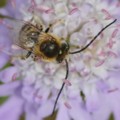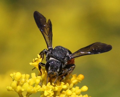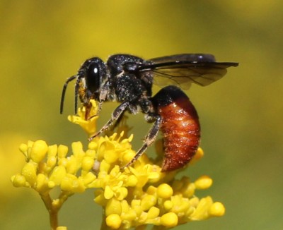 ・赤い腹が特徴のハキリバチ。「オオハキリバチ」の巣に寄生する。