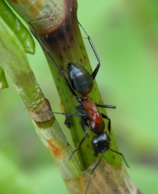 ・胸部と腹部の前方が赤褐色をしたアリ。