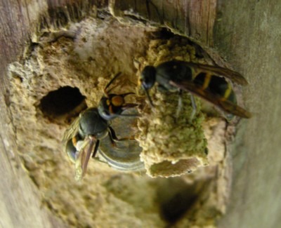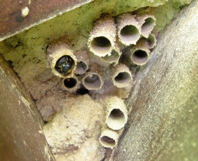 | ・エントツドロバチとも呼ばれ、竹筒やすき間などに泥で巣を作り、煙突状の入口をつける。 |
