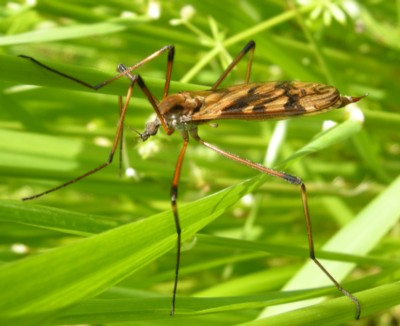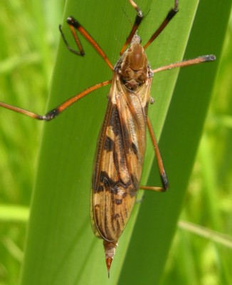 ・全体に黄褐色〜赤褐色、翅には黒色の斑紋がある大型のヒメガガンボ。