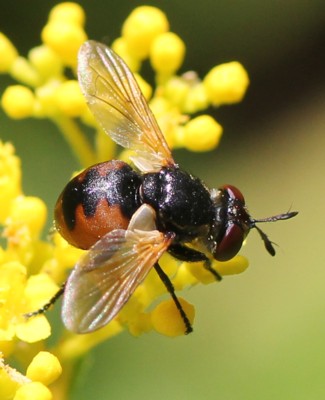 ・丸っこくて扁平な体をしたヤドリバエの仲間。