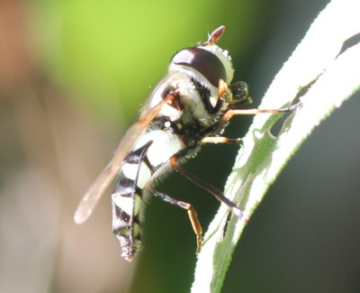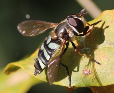 ・黒い体に水色の横帯があるヒラタアブ。