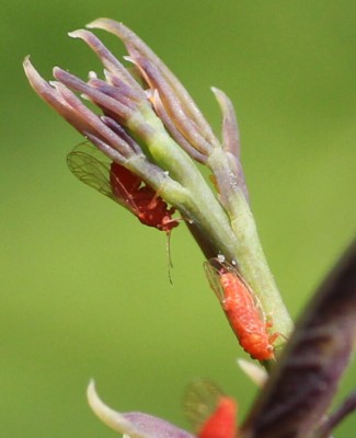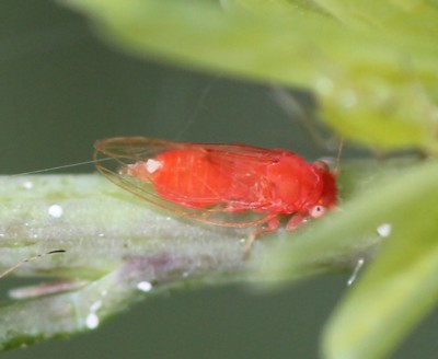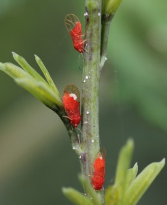 ・体は朱〜赤紅色、翅は透明をしたキジラミ。