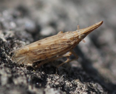 ・頭部が著しく前方へ突出したウンカの仲間。全体に淡暗黄色で、翅には小さな褐色の斑紋がある。