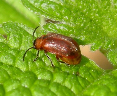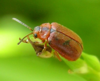 アカタデハムシ・・・てっきり赤い色をした「タデ科」の植物を好むハムシだと思った。しかし、食草は「サクラ」や「トサミズキ」など、全く違う植物のようです。 |