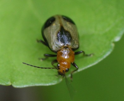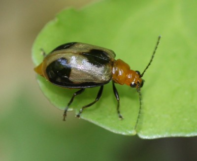 ・頭胸部、腹部は黄褐色。上翅は淡黄色で、黒色の斑紋がある。同じ仲間「ヨツボシハムシ」