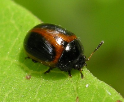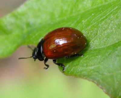 ・頭部、胸部は黒く、上翅は赤褐色をしたハムシ。上翅には9条の点刻列がある。