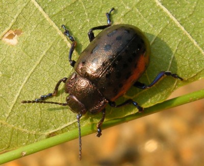 ・上面は金属光沢のある銅色で、上翅には黒色の円紋列があり、腹面、肢は金属光沢のある黒紫色。