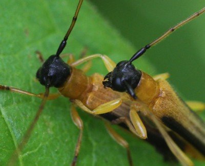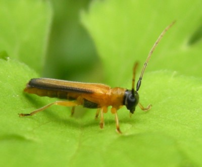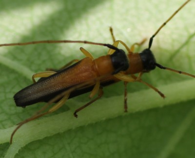 ・頭部は黒く、前胸背は黄褐色、上翅は黄褐色で縁は黒色をしている。