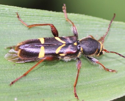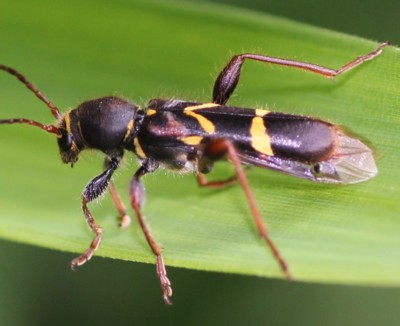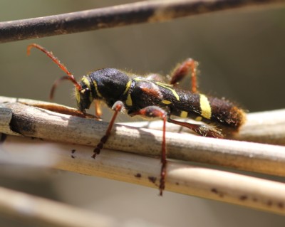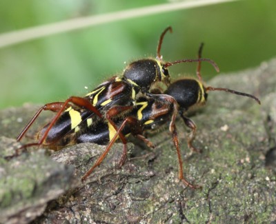 このような色彩をしたカミキリムシは多数あり、ハチの仲間に擬態したと言われる。