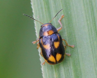久しぶりに初見のハムシを見つけたと思ったら、数枚撮っただけで逃げられてしまいました。残念。この個体の上翅の黄色紋は、四つに分かれていますが、上下の二つがすじ状に繋がっているのが普通のようです。 |