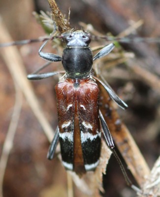 ・頭、胸部は黒色。上翅の前半は赤褐色、後半は黒色で、白色の紋がある。