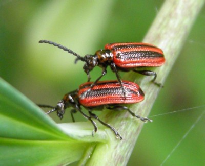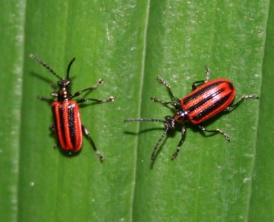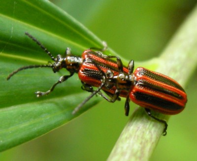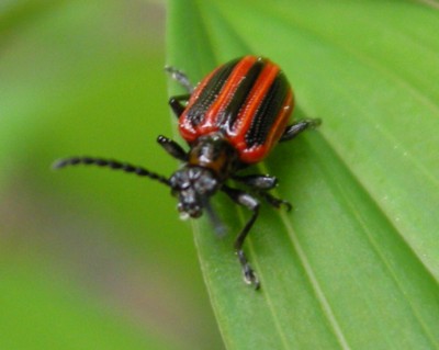 ・赤と黒の縦縞模様をしたハムシ。