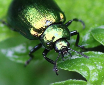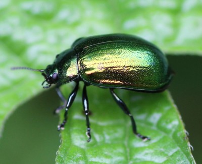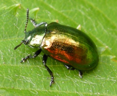 俗に言う瑠璃色、紫がかった青色をしたハムシよりは、こちらの方が綺麗です。 |